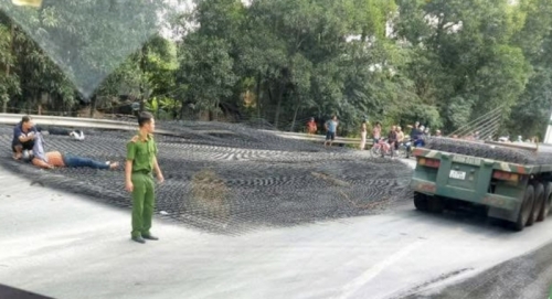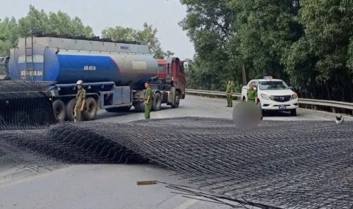 Tại hiện trường hàng tấn tấm thép lưới công trình rơi từ rơ-mooc xuống phủ kín mặt đường. Sự cố xảy ra khiến giao thông qua khu vực này bị ùn ứ kéo dài. CSGT và Công an địa phương đã phong tỏa hiện trường xử lý sự cố.