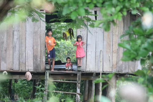 Y Đời (trái) và 2 em nhỏ trong căn nhà trống hoác ở mép sông |