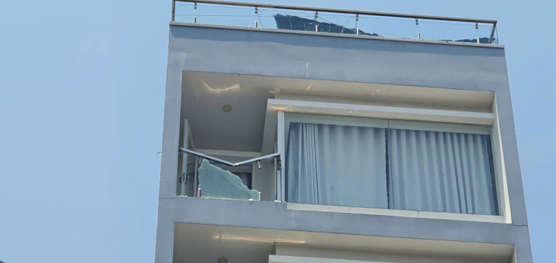 Tại hiện trường, một phần cửa kính ban công tầng 7 căn hộ cho thuê bị vỡ rơi mảnh kính xuống bên dưới, một số dây cáp viễn thông bị đứt, kính chắn gió xe ô tô du lịch bị rạn nứt.