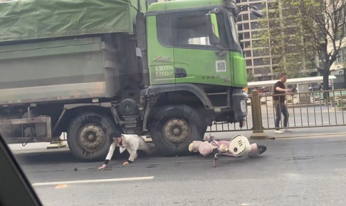 May mắn thay, chiếc xe tải chở vật liệu xây dựng đang quay đầu với tốc độ chậm và đã dừng lại kịp thời. Người phụ nữ có thể bò ra khỏi gầm xe ngay lập tức và chỉ bị bầm tím nhẹ; cô không gặp nguy hiểm đến tính mạng.