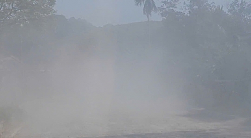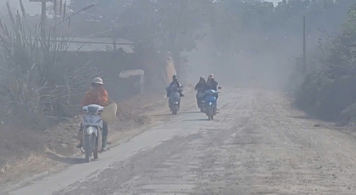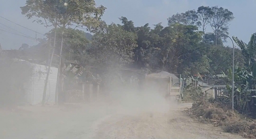 Bụi bay trắng trời, hoàn toàn che khuất tầm nhìn và khu vực xung quanh mỗi khi xe tải chạy qua tuyến đường. |