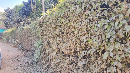 Bụi biến hàng rào cây xanh bên đường thành bức tường xám trắng. |