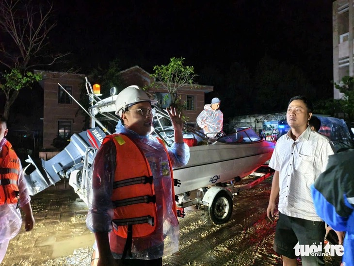 Đoàn cứu hộ dùng mô tô nước tiếp cận khu vực nhà anh Lý Văn Đường, nhưng nước quá sâu, các công trình chìm trong bóng tối, ca nô không thể vượt qua.