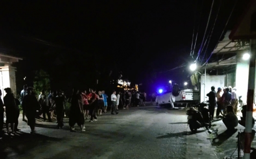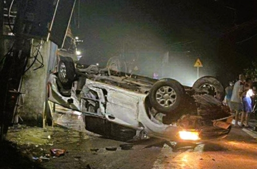 Tại hiện trường, chiếc ô tô lật ngửa, nổ lốp trước, hư hỏng nặng phần đầu, xe máy văng xa khoảng 20 m sau tai nạn.