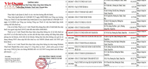 Danh sách công khai kèm theo cho thấy Công ty cổ phần Đông Sơn (MST 2802304373) nợ số tiền 156.810.218.577 đồng, địa chỉ trụ sở tại số 745 Bà Triệu, phường Hạc Thành, TP. Thanh Hoá. Biện pháp cưỡng chế được ghi nhận là “ngừng sử dụng hóa đơn”.