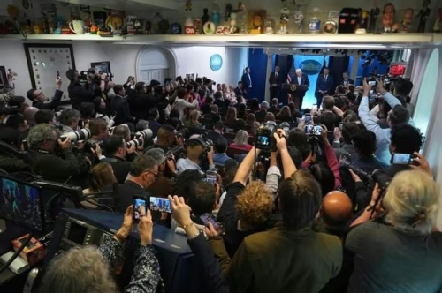 Khung cảnh cuộc họp báo của Tổng thống Donald Trump tại Nhà Trắng hôm 6-4. Ảnh: AP |