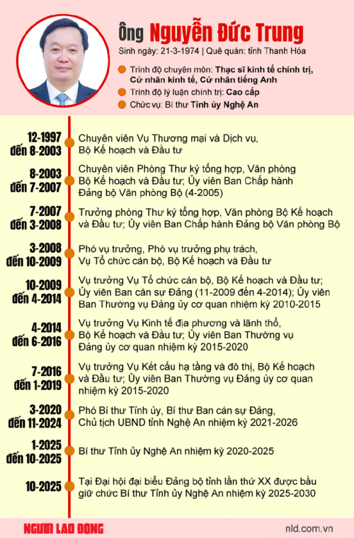 Trước đó, chiều 10-11, Bộ Chính trị quyết định ông Nguyễn Đức Trung thôi tham gia Ban Chấp hành, Ban Thường vụ và thôi giữ chức Bí thư Tỉnh ủy tỉnh Nghệ An nhiệm kỳ 2025-2030. Ông Nguyễn Đức Trung được điều động, chỉ định tham gia Ban chấp hành, Ban Thường vụ Thành ủy Hà Nội, giữ chức Phó Bí thư Thành ủy Hà Nội nhiệm kỳ 2025-2030.
