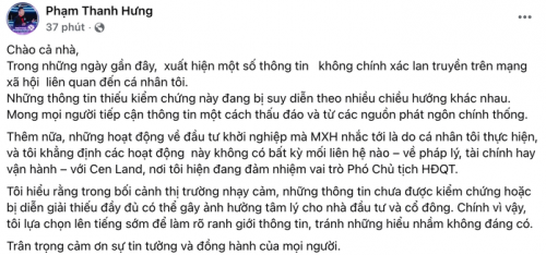 Ông Phạm Thanh Hưng khẳng định những hoạt động về đầu tư khởi nghiệp mà mạng xã hội nhắc tới là do cá nhân ông thực hiện, không có bất kỳ mối liên hệ nào về pháp lý, tài chính hay vận hành với Cen Land (Công ty CP Bất động sản Thế Kỷ), nơi ông đang đảm nhận vai trò phó chủ tịch HĐQT.