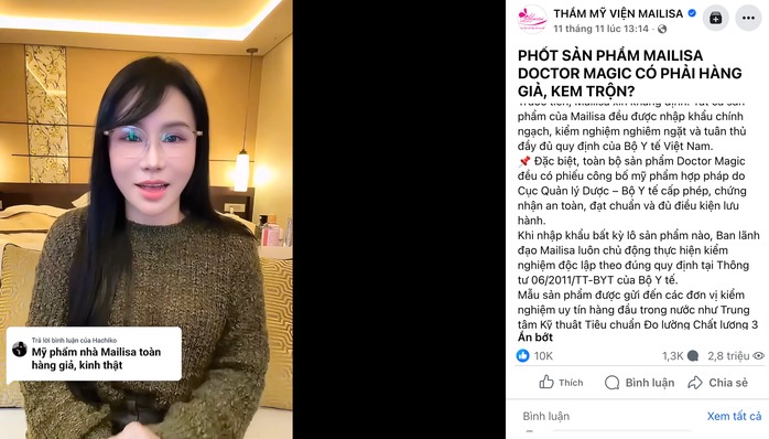 Trước đó, Cục Quản lý Dược (Bộ Y tế) đã công bố danh sách 162 sản phẩm mỹ phẩm do Công ty MK Skincare (doanh nghiệp thuộc hệ sinh thái của Mailisa), nhập khẩu và công bố.