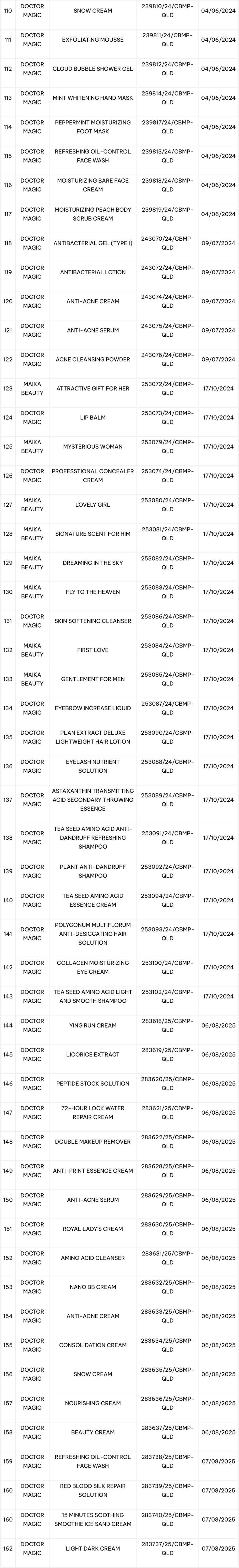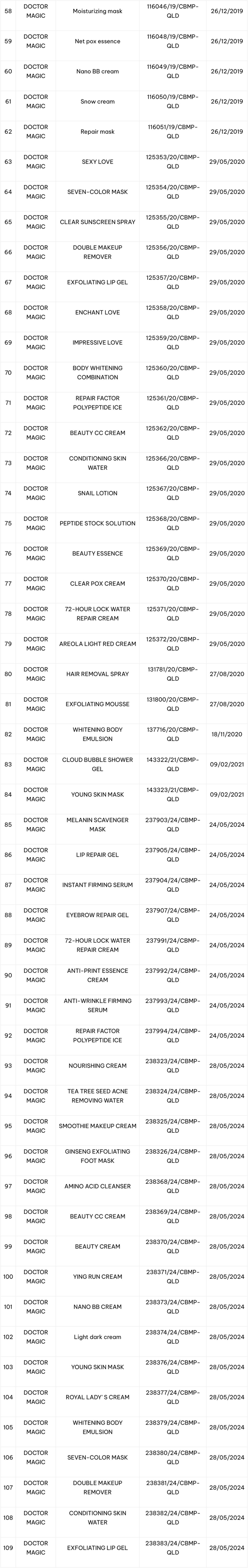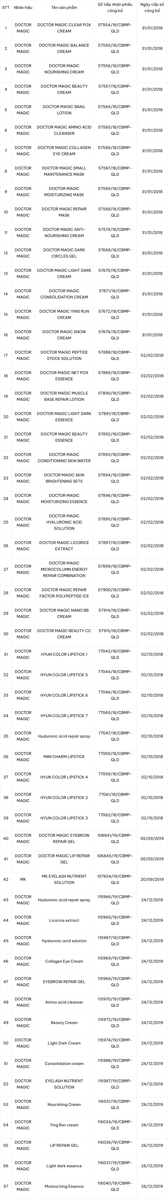 Theo danh sách này, Cục Quản lý Dược cho biết qua thống kê, từ năm 2018 đến nay, đơn vị đã cấp 162 phiếu công bố sản phẩm mỹ phẩm cho MK Skincare, trong đó phần lớn là sản phẩm dòng Doctor Magic được quảng bá là sản phẩm có xuất xứ từ Hồng Kông (Trung Quốc). Hiện 81 phiếu công bố sản phẩm mỹ phẩm còn hiệu lực.