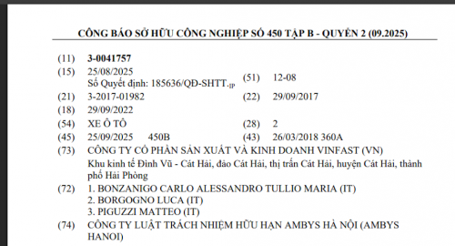 Cục Sở hữu trí tuệ Việt Nam mới đây công bố Công báo sở hữu công nghiệp, trong đó xuất hiện hình ảnh thiết kế một mẫu ô tô do VinFast đứng tên.