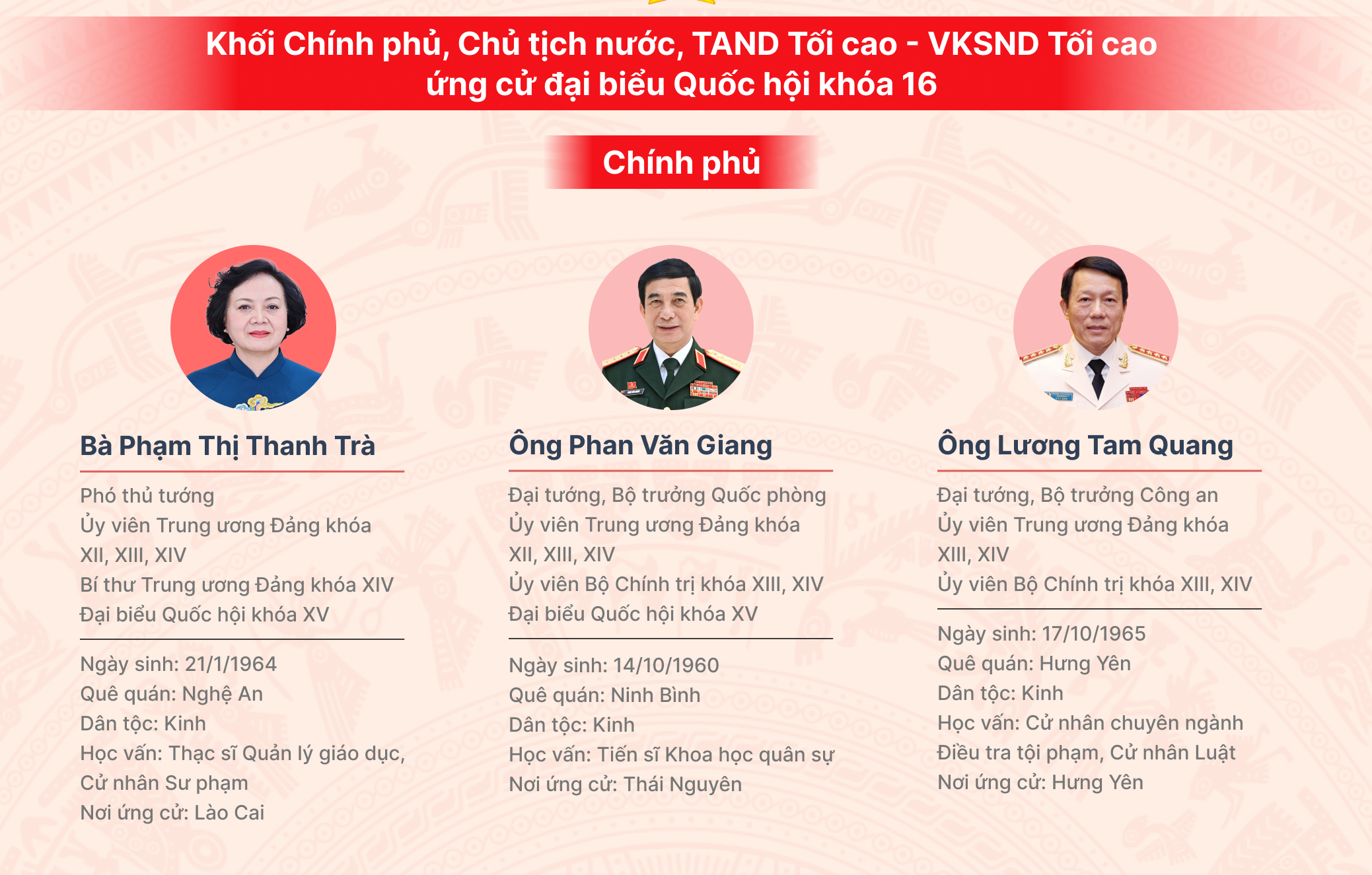 Ứng viên đại biểu Quốc hội khóa 16 thuộc khối Chính phủ, Chủ tịch nước, Tư pháp