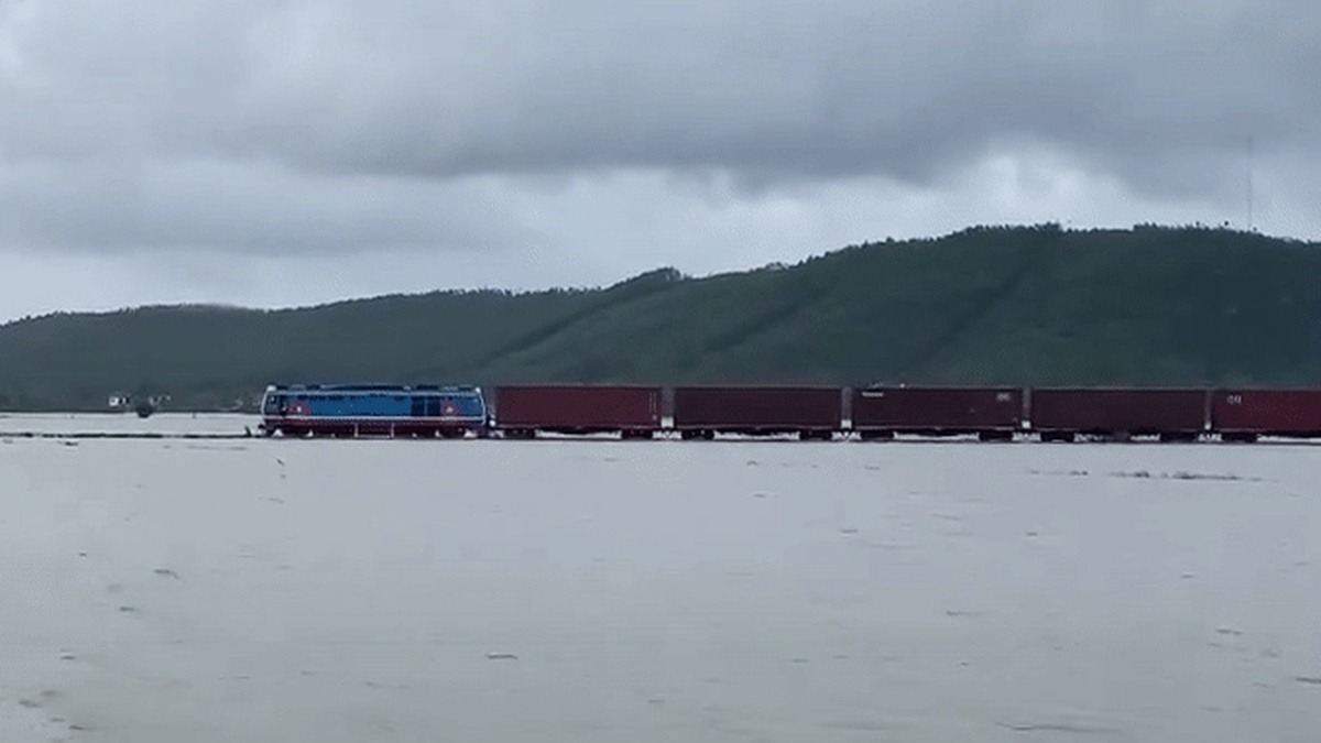 Cảnh đoàn tàu hỏa chạy giữa mênh mông nước lũ thu hút sự chú ý từ cư dân mạng.