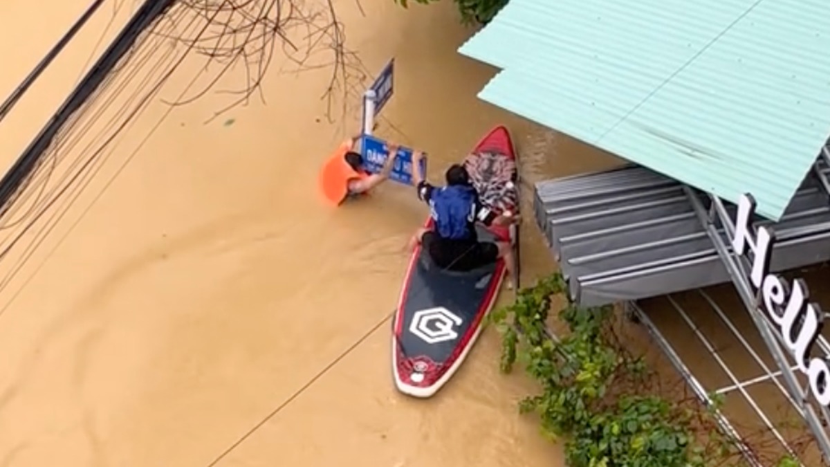 Giữa dòng lũ cuồn cuộn ở Khánh Hòa, người đàn ông chỉ kịp mặc vội chiếc áo mưa rồi lao lên chiếc sup nhỏ, chèo thẳng vào vùng nước sâu để cứu nam thanh niên.