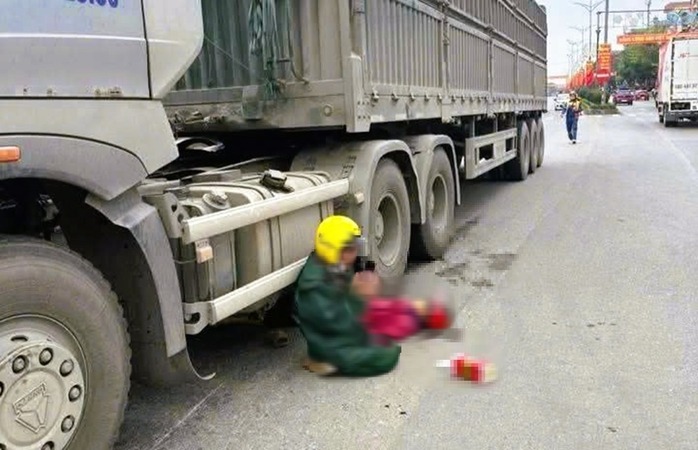Chồng quỳ gối chắp tay bên t.h.i t.h.ể vợ bị xe đầu kéo c.á.n t.ử v.o.n.g