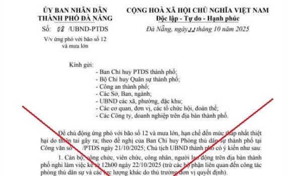 Đà Nẵng khẳng định thông tin lan truyền trên mạng xã hội về việc thành phố ban hành chủ trương nghỉ làm việc, dừng hoạt động các chợ từ chiều 22/10 do bão số 12 là hoàn toàn giả mạo.