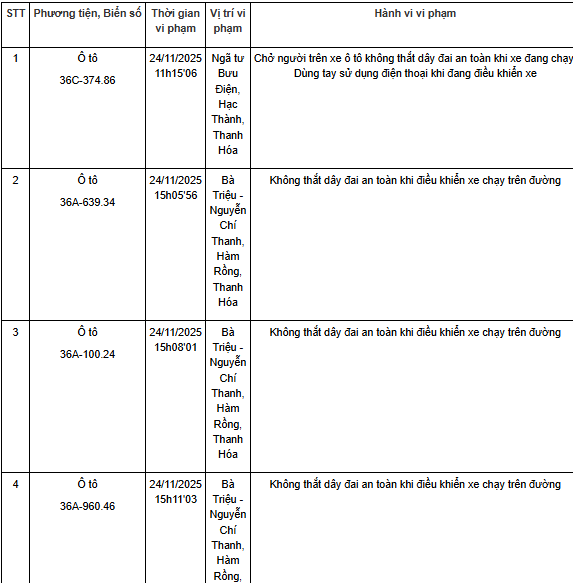 Phòng Cảnh sát giao thông, Công an tỉnh Thanh Hoá thông báo các phương tiện vi phạm về TTATGT đường bộ được phát hiện qua Hệ thống camera giám sát an ninh, trật tự và an toàn giao thông trên địa bàn từ ngày 24/11/2025 đến ngày 30/11/2025, cụ thể như sau:
