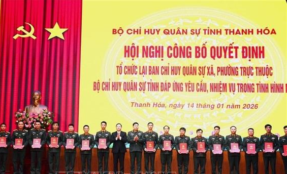 Ngày 14/1, tại Trung tâm hội nghị 25 B, phường Hạc Thành, tỉnh Thanh Hóa, Bộ Chỉ huy Quân sự tỉnh Thanh Hóa tổ chức Hội nghị công bố quyết định của Bộ Quốc phòng, Bộ Tổng Tham mưu về việc tổ chức lại Ban Chỉ huy Quân sự cấp xã, phường và bổ nhiệm chức vụ đối với 166 đồng chí Chỉ huy trưởng Ban Chỉ huy quân sự xã, phường trên địa bàn tỉnh.