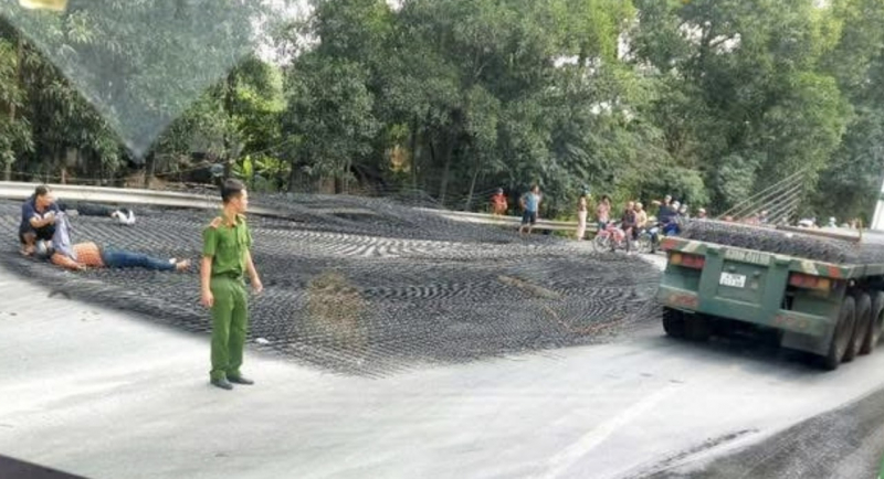 Hàng tấn thép lưới rơi từ xe đầu kéo xuống đường đè 2 người đi xe máy
