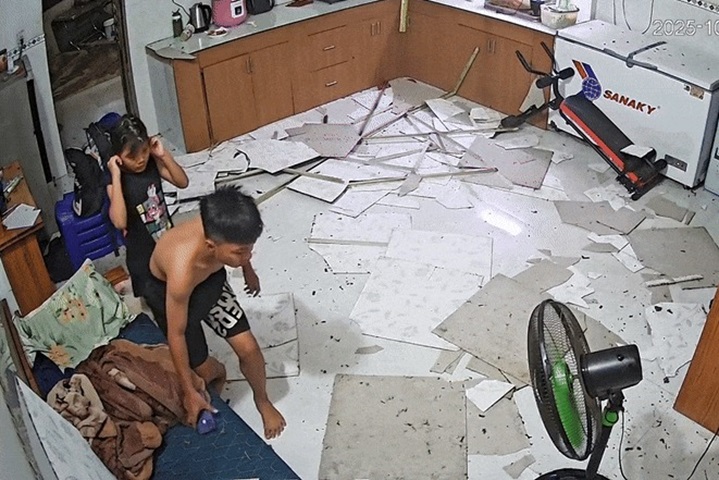 Hai anh em thót tim khi mảng trần nhà đổ sập