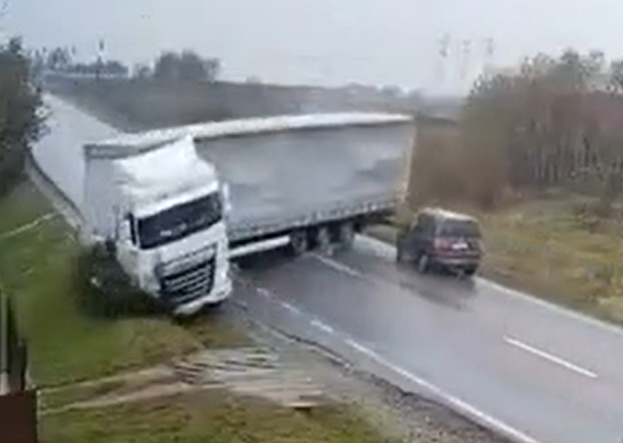 Đoạn clip ghi lại khoảnh khắc một chiếc xe tải lật nghiêng trên con đường ngập nước, đè bẹp ô tô con khiến hai người đàn ông bị kẹt bên trong.
