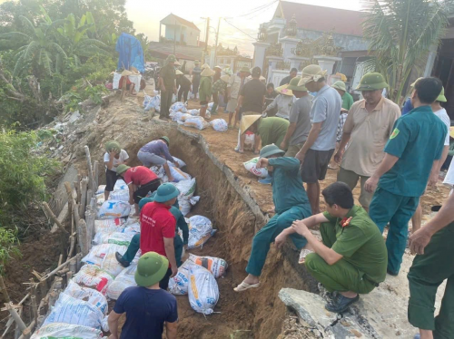 Trước khi bão số 9 đổ bộ, chính quyền địa phương phải huy động hàng chục chiến sĩ công an, cán bộ và nhân dân dùng cọc tre, bao cát, thép b40, bãi để tổ chức gia cố, đảm bảo tạm thời.