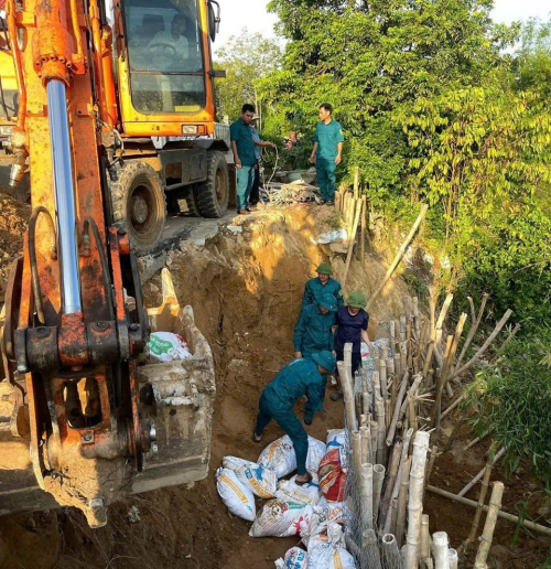 Lực lượng chức năng gia cố tạm thời sạt lở suối Khe Chậm |