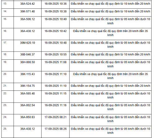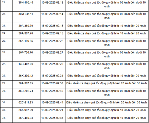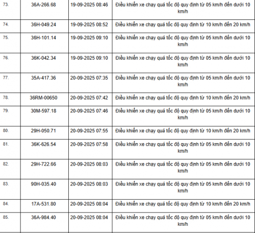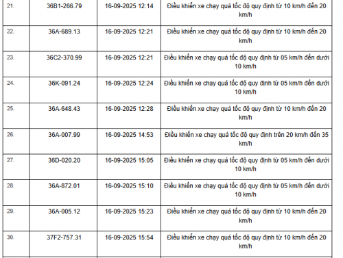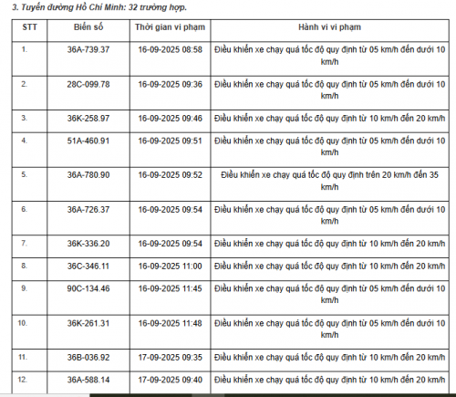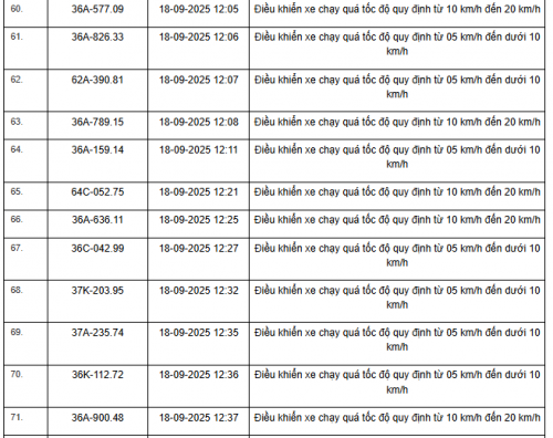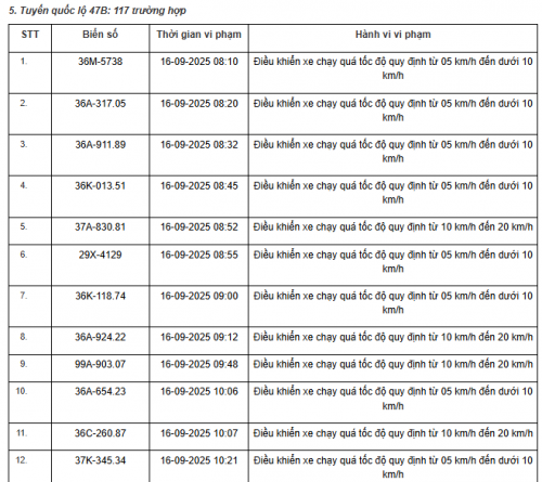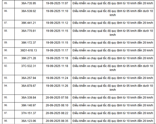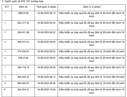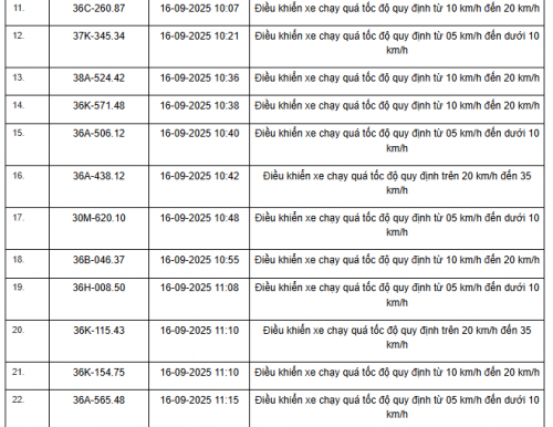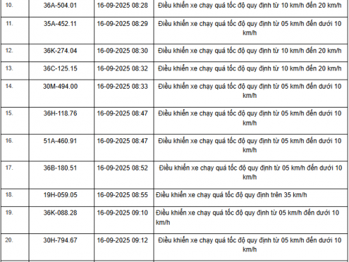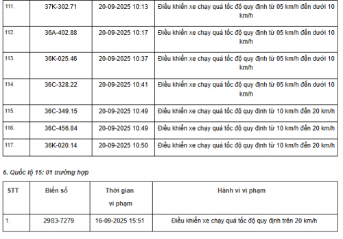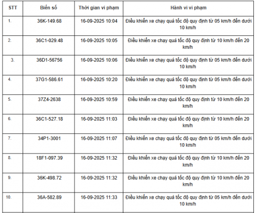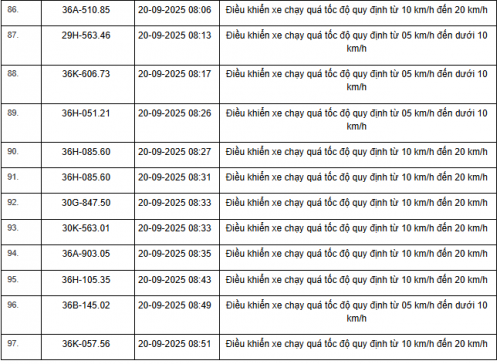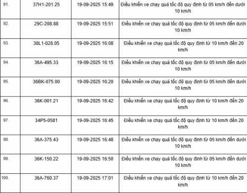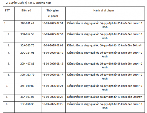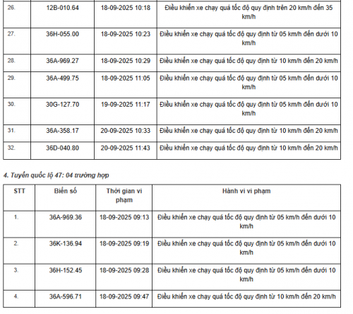 Từ ngày 16/9/2025 đến ngày 20/9/2025, thông qua thiết bị kỹ thuật nghiệp vụ, các tổ công tác của phòng Cảnh sát giao thông Thanh Hoá đã phát hiện, ghi nhận bằng hình ảnh đối với tổng số 360 trường hợp phương tiện vi phạm quy định về tốc độ trên tuyến Quốc lộ, đã gửi thông báo phục vụ “Xử phạt nguội” (Có danh sách kèm theo).