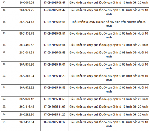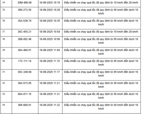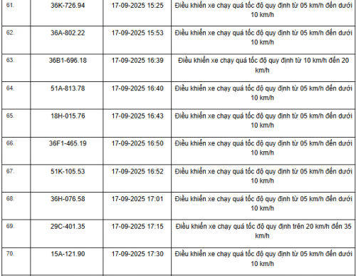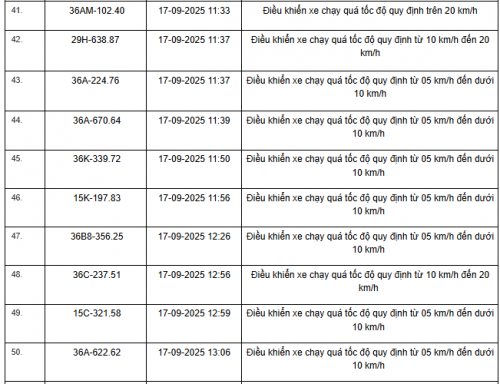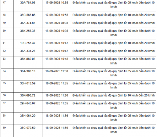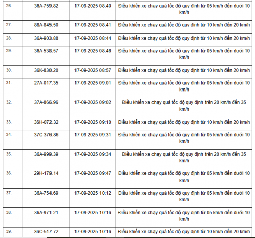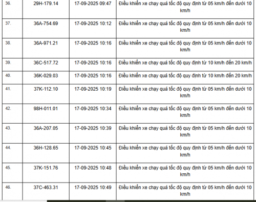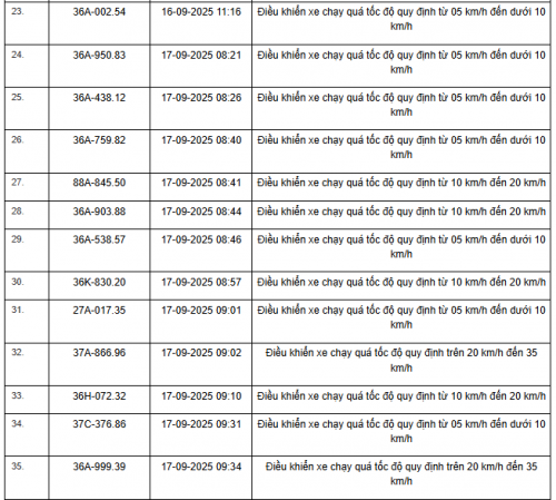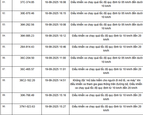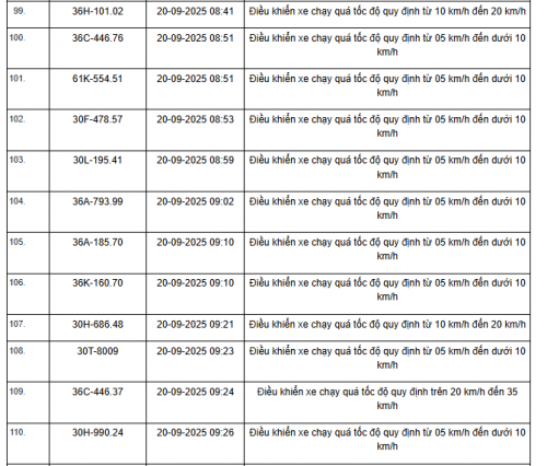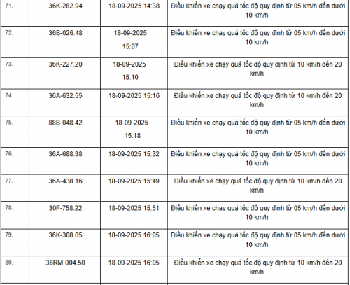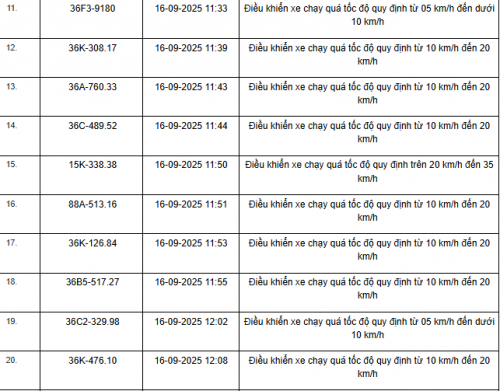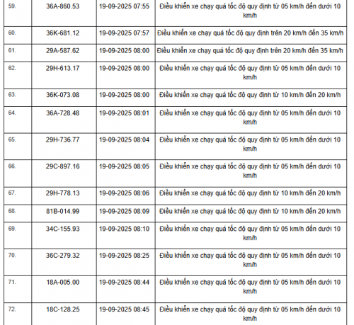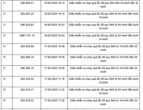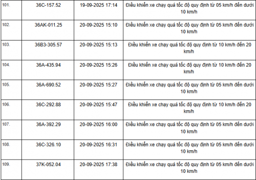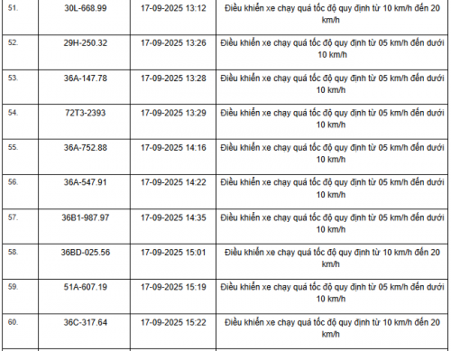 Từ ngày 16/9/2025 đến ngày 20/9/2025, thông qua thiết bị kỹ thuật nghiệp vụ, các tổ công tác của phòng Cảnh sát giao thông Thanh Hoá đã phát hiện, ghi nhận bằng hình ảnh đối với tổng số 360 trường hợp phương tiện vi phạm quy định về tốc độ trên tuyến Quốc lộ, đã gửi thông báo phục vụ “Xử phạt nguội” (Có danh sách kèm theo).