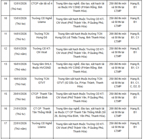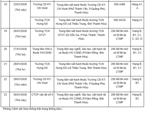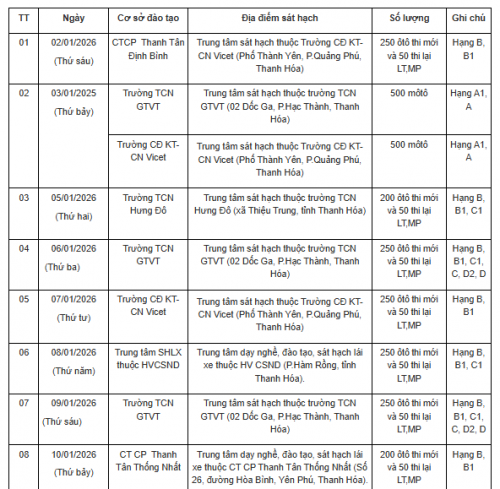 Thực hiện Thông tư số 12/2025/TT-BCA ngày 28/2/2025 của Bộ trưởng Bộ Công an quy định về sát hạch, cấp giấy phép lái xe; cấp, sử dụng giấy phép lái xe quốc tế; xét hồ sơ đề nghị cấp giấy phép lái xe của các cơ sở đào tạo lái xe, sau khi trao đổi thống nhất với các Trung tâm đào tạo, Trung tâm sát hạch lái xe. Phòng Cảnh sát giao thông Công an tỉnh Thanh Hoá thông báo lịch tổ chức sát hạch, cấp Giấy phép lái xe trên địa bàn tỉnh tháng 01/2026.