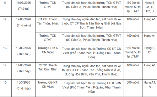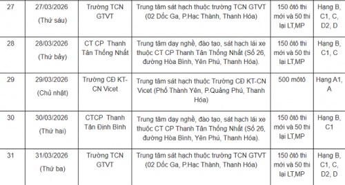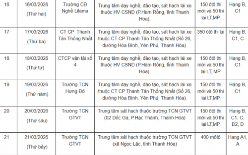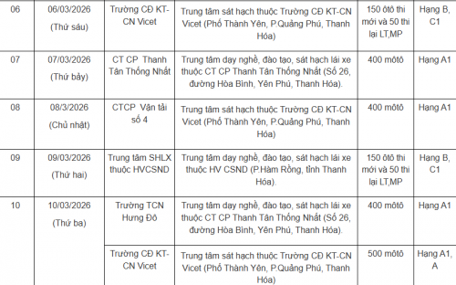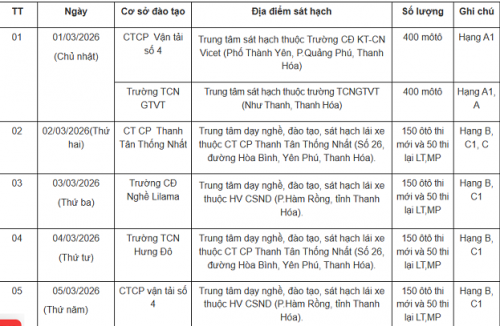 Thực hiện Thông tư số 12/2025/TT-BCA ngày 28/2/2025 của Bộ trưởng Bộ Công an quy định về sát hạch, cấp giấy phép lái xe; cấp, sử dụng giấy phép lái xe quốc tế; xét hồ sơ đề nghị cấp giấy phép lái xe của các cơ sở đào tạo lái xe, sau khi trao đổi thống nhất với các Trung tâm đào tạo, Trung tâm sát hạch lái xe. Phòng Cảnh sát giao thông Công an tỉnh Thanh Hoá thông báo lịch tổ chức sát hạch, cấp Giấy phép lái xe trên địa bàn tỉnh tháng 03/2026.