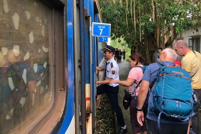 Nhân viên đường sắt hỗ trợ khách nước ngoài lên tàu, ngày 30/9. Ảnh: Đơn vị cung cấp. |