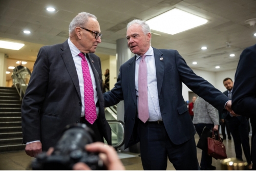 Lãnh đạo phe thiểu số tại Thượng viện Chuck Schumer và Thượng nghị sĩ Tim Kaine, đồng tác giả của dự luật về “sức mạnh chiến tranh”. Ảnh: Politico |