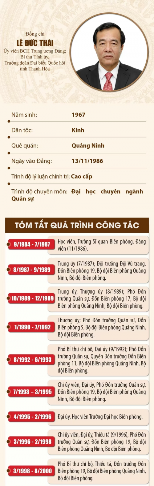 Báo và Phát thanh, truyền hình Thanh Hóa trân trọng giới thiệu Tiểu sử đồng chí Lê Đức Thái, Ủy viên Ban Chấp hành Trung ương Đảng, Bí thư Tỉnh ủy, Trưởng đoàn Đại biểu Quốc hội tỉnh Thanh Hóa.