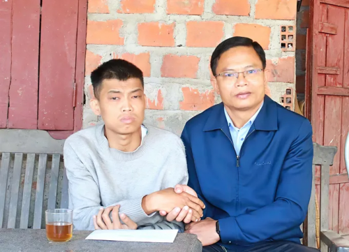 Ông Phạm Văn Phương, Bí thư Đảng ủy, Chủ tịch HĐND xã Ia Hiao và Thượng tá Ksor Rim, Trưởng Công an xã Ia Hiao, thay mặt bạn đọc Báo SGGP trao tiền hỗ trợ, đồng thời chuyển lời thăm hỏi, động viên của bạn đọc đến anh Hồ Thanh Sĩ, chúc anh sớm vượt qua bệnh tật.