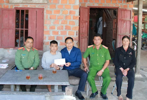 Ông Phạm Văn Phương, Bí thư Đảng ủy, Chủ tịch HĐND xã Ia Hiao và Thượng tá Ksor Rim, Trưởng Công an xã Ia Hiao trao tiền hỗ hỗ trợ cho anh Sĩ |