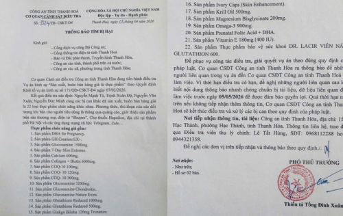 Thiếu tá Tống Đình Xuân, Phó Thủ trưởng Cơ quan Cảnh sát điều tra Công an tỉnh Thanh Hóa ngày 3-4 vừa ký thông báo tìm bị hại trong vụ án "Sản xuất, buôn bán hàng giả là thực phẩm" theo Quyết định khởi tố vụ án ngày 7-2-2026. Quá trình điều tra, cơ quan điều tra đã thu giữ nhiều sản phẩm thực phẩm chức năng giả.