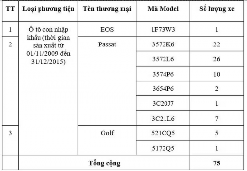 Chương trình triệu hồi được thực hiện để kiểm tra và thay thế linh kiện túi khí TAKATA trên vô lăng lái ở một số mẫu xe Volkswagen EOS, Passat, Golf được sản xuất từ năm 2009 đến 2015 do Công ty TNHH Ô tô Thế Giới nhập khẩu và phân phối theo chương trình triệu hồi số 69EJ của hãng Volkswagen AG.
