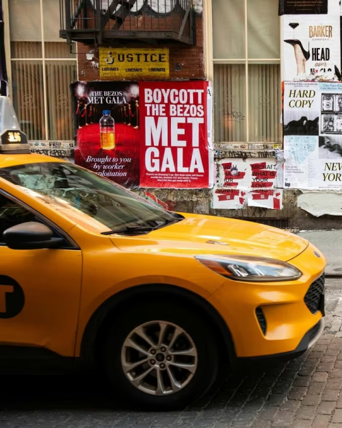 “Met Gala của Bezos diễn ra nhờ bóc lột sức lao động”, một poster dán gần bảo tàng ghi, ám chỉ các cáo buộc về điều kiện làm việc tại hệ thống kho vận của Amazon.
