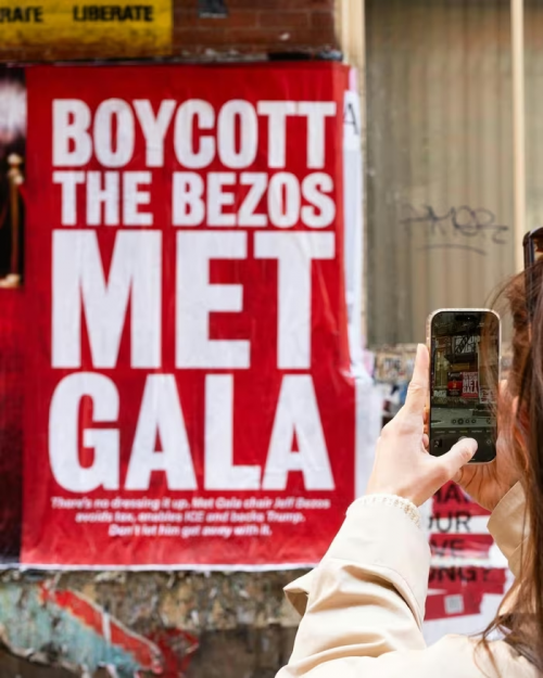 Cuối tuần qua, hàng loạt poster xuất hiện trên vỉa hè và tàu điện ngầm tại New York (Mỹ), kêu gọi người dân tẩy chay Met Gala 2026 vì sự góp mặt của tỷ phú công nghệ Jeff Bezos trong vai trò tài trợ, theo The New York Times.