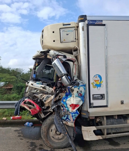 Cú va chạm mạnh khiến phần đầu xe tải biến dạng hoàn toàn, tài xế bị kẹt trong cabin và tử vong tại chỗ. Xe đầu kéo bị hư hỏng nhẹ ở đuôi rơ-moóc.
