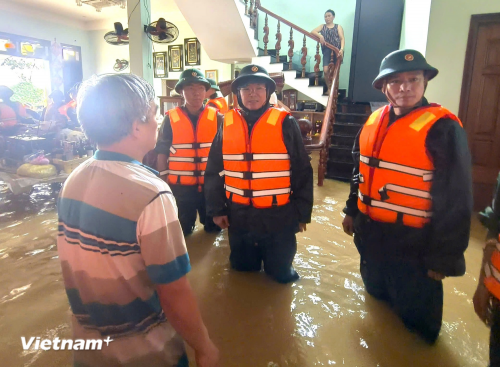 Đại tá Lương Đình Chung – Bí thư Đảng ủy, Chính ủy Quân khu 5 vượt lũ lớn trục tiếp đến thăm hỏi, động viên khu vực ngập lụt tại Đà Nẵng. (Ảnh: PV/Vietnam+) |